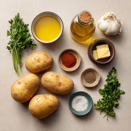 - Russet Potatoes: 4 medium-sized – Their starchy texture turns crispy on the outside and fluffy inside.