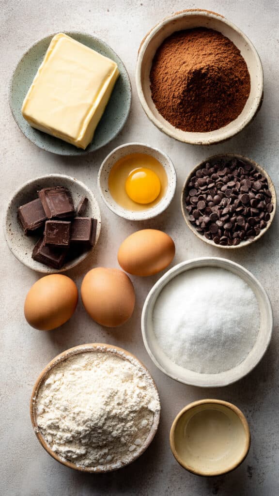 - Eggs: 2 large + Provide structure and a fudgy texture.