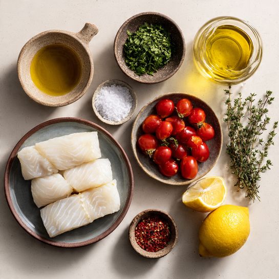 The cod remains moist and tender while absorbing the fresh flavors of tomatoes, lemon, and herbs. The slight acidity of lemon and sweetness of cherry tomatoes balance the richness of olive oil for a bright, aromatic finish.