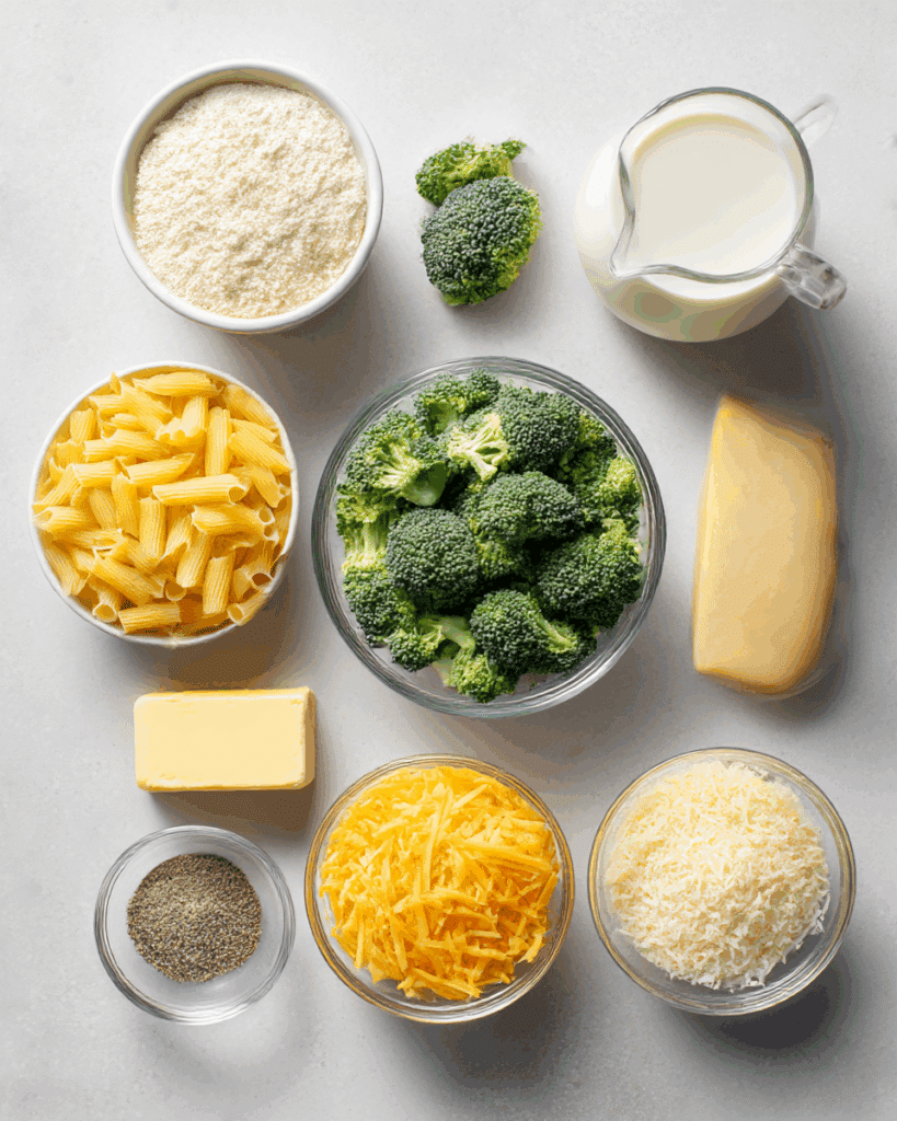 Cheddar Cheese: Sharp cheddar melts into a smooth, tangy sauce that coats the pasta beautifully. Its bold flavor stands up to the mild broccoli, creating a rich and savory profile.