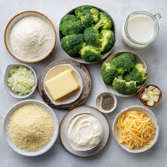 Blanch the broccoli in boiling water for 2–3 minutes, then drain and set aside. In a large pan, melt butter and sauté onion and garlic until soft. Sprinkle in flour and whisk for 1 minute. Slowly pour in milk, whisking constantly, until smooth and thickened. - Prepare Your Cooking Vessel: