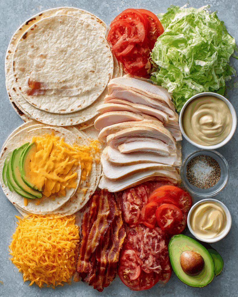 Lay each tortilla flat. Spread the mayo-mustard mix, then layer with turkey, bacon, cheese, avocado, tomato slices, and lettuce. Season lightly with salt and pepper. - Cook to Perfection: