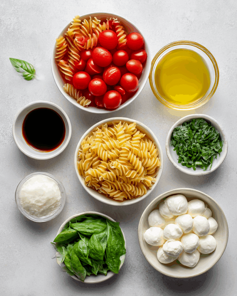 - Combine Ingredients: While the pasta cooks, halve your cherry tomatoes and mozzarella balls, and tear your basil.