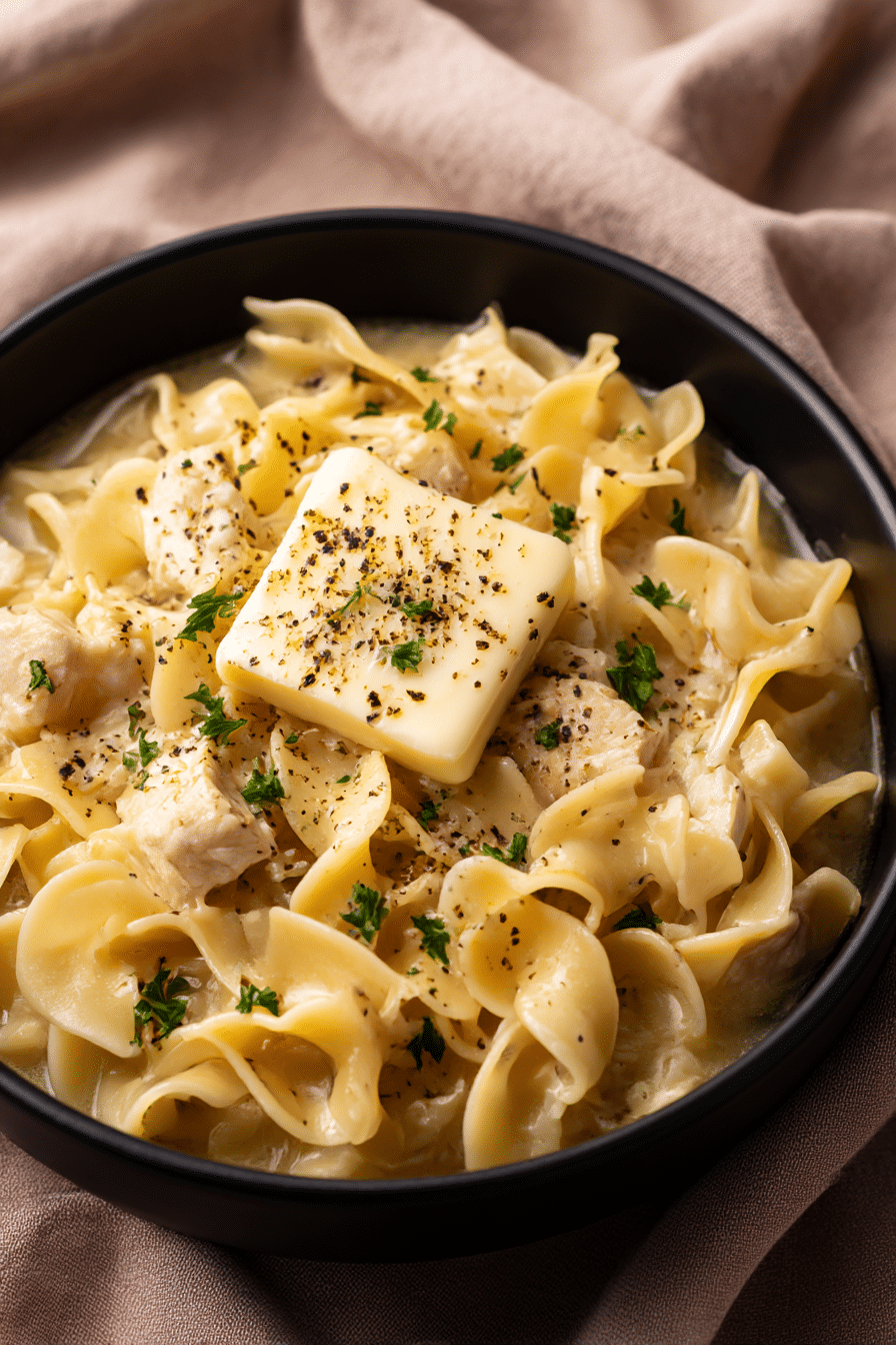 Presentation counts, even for comfort food. Serve in wide, shallow bowls so the noodles can shine. Garnish with chopped parsley, thyme sprigs, or a pat of butter melting on top for that “wow” touch.