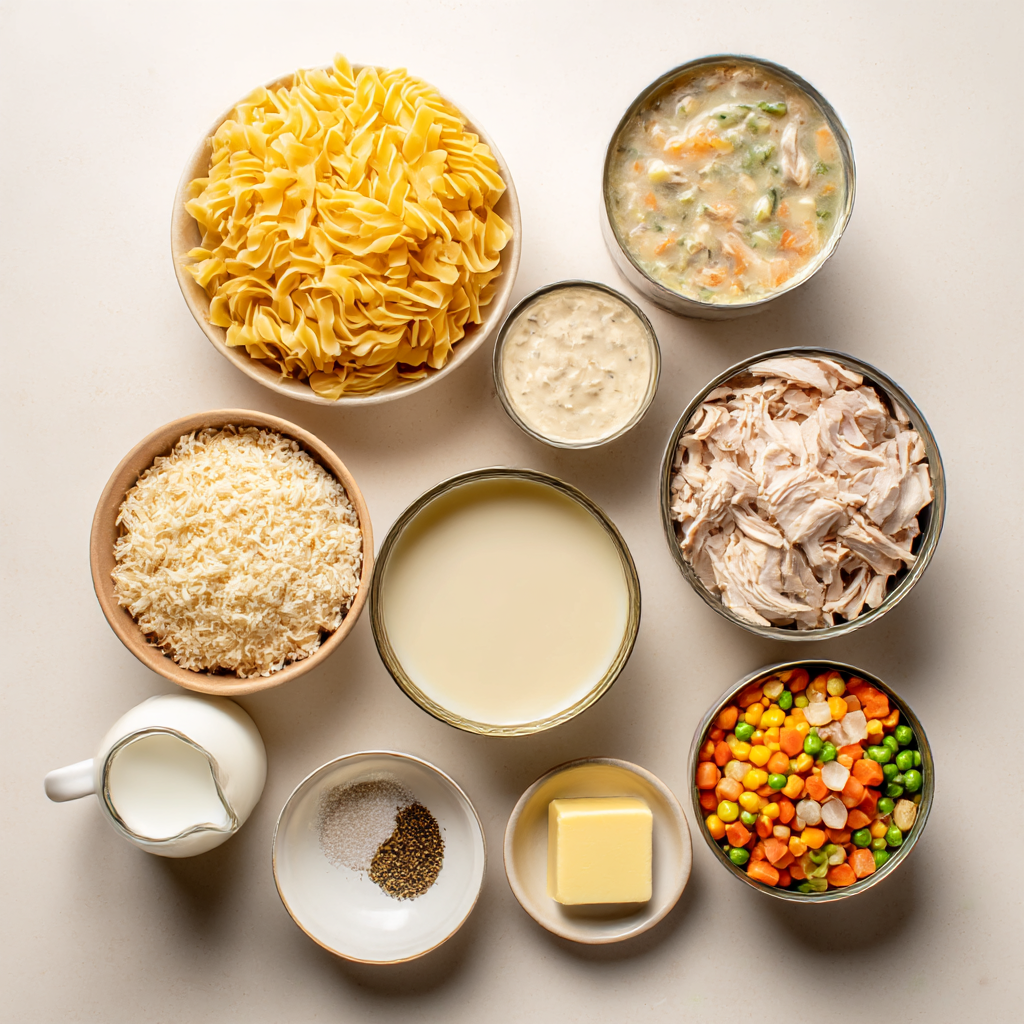 - Pasta: 12 ounces (penne, rotini, or egg noodles) – The base that holds everything together.