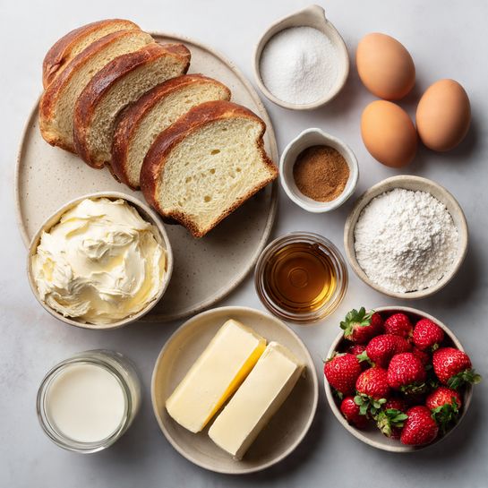 This recipe was born on a quiet Sunday when I had some leftover challah bread and a craving for something cozy. I remembered a cream cheese filling I used for a brunch pastry and thought, why not tuck it inside French toast? The result was something between a cheesecake and a classic breakfast — crisp on the outside, creamy and rich in the middle, and just begging for fresh strawberries on top.