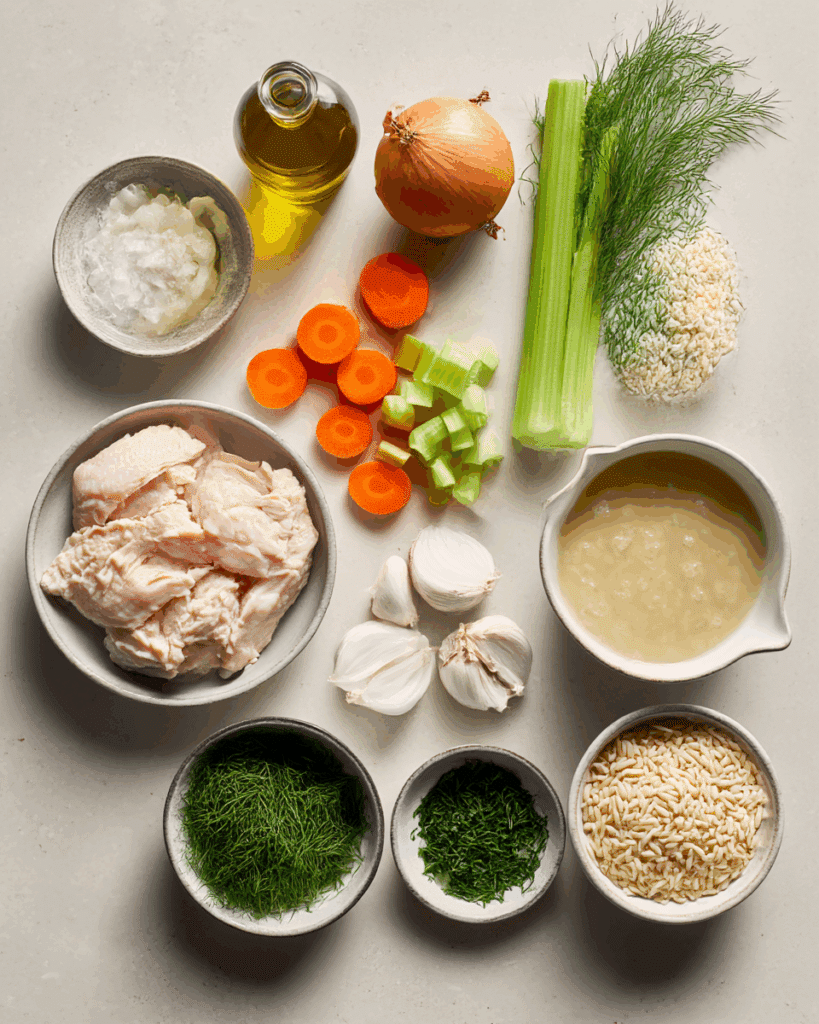 Ingredients in Creamy Chicken and Orzo Soup with Fresh Dill