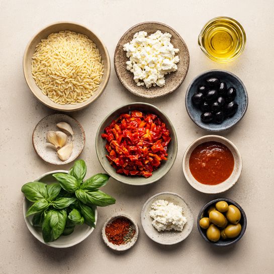 - Orzo (Risoni): 1 1/2 cups — Small pasta that soaks up sauce beautifully.