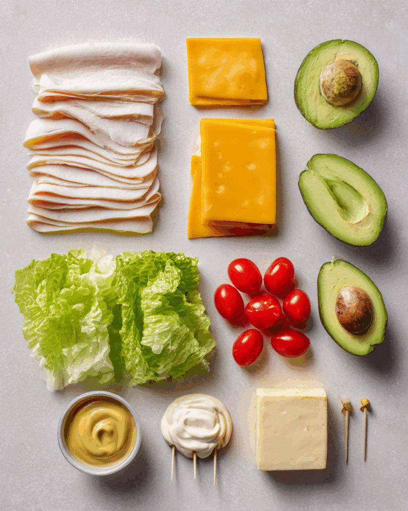 - Layer lettuce, turkey slice, avocado slice, and a cherry tomato half on each.