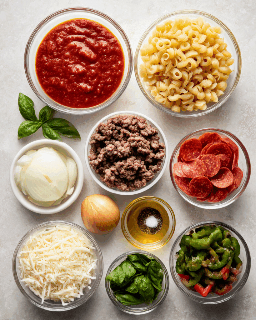 The creamy sauce coating the pasta, the savory sausage, the snap of bell peppers, the salty pepperoni, the richness of melted mozzarella, all come together to mimic the experience of eating a pizza slice—but in scoopable casserole form. The cheese pull, the crispy pepperoni edges, the hearty pasta beneath—it’s all the pleasure of pizza with better practicality.