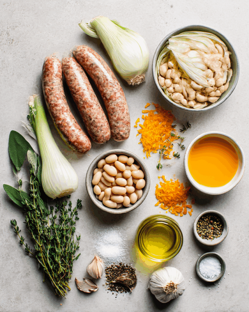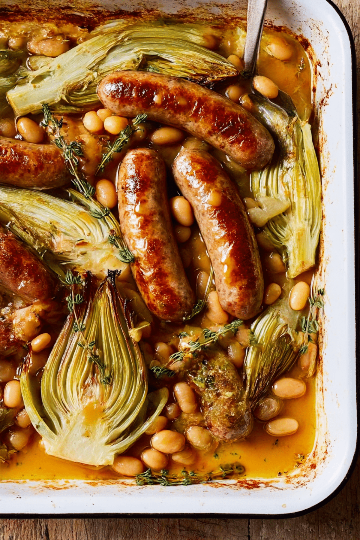 - Prepare Your Cooking Vessel: Place fennel wedges on the tray and nestle sausages between them. Pour the bean mixture around.