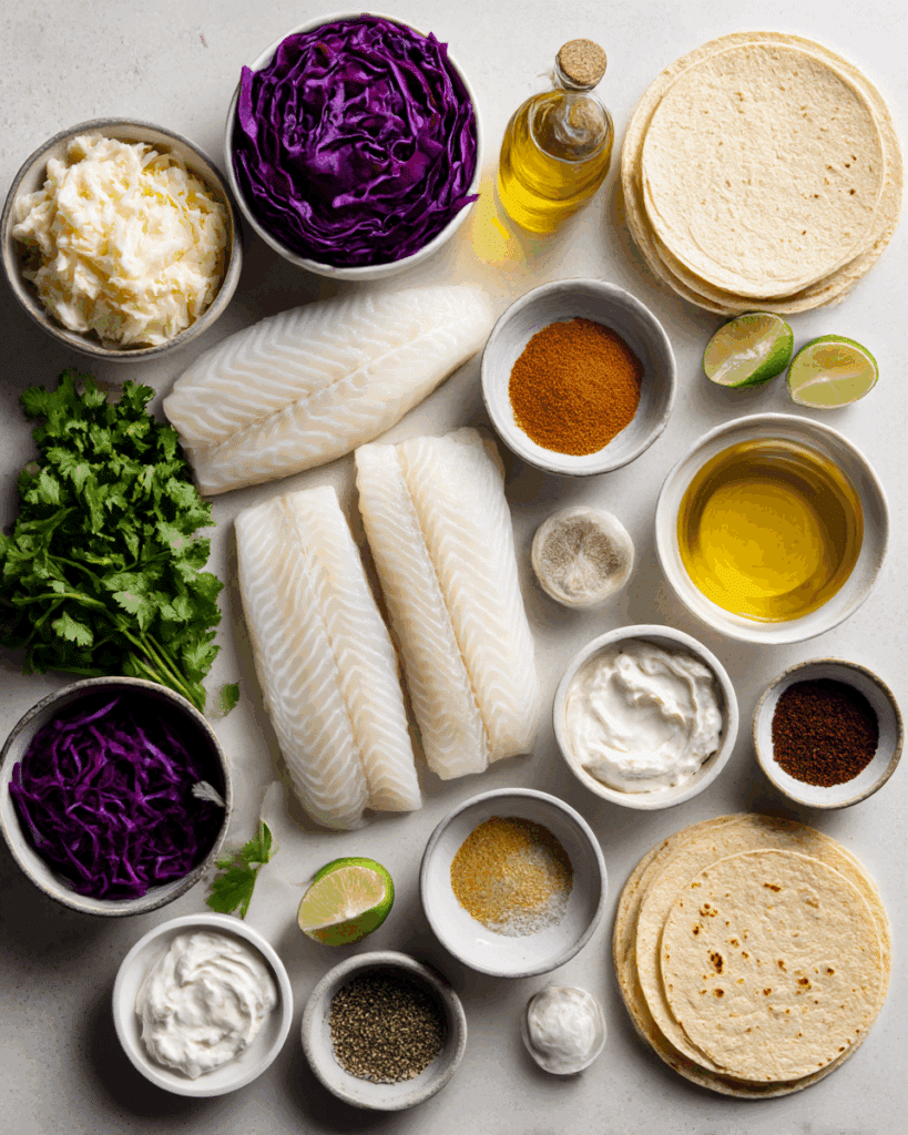 - White Fish Fillets: 1 pound (like cod, tilapia, or haddock) — flaky, mild, and perfect for tacos.