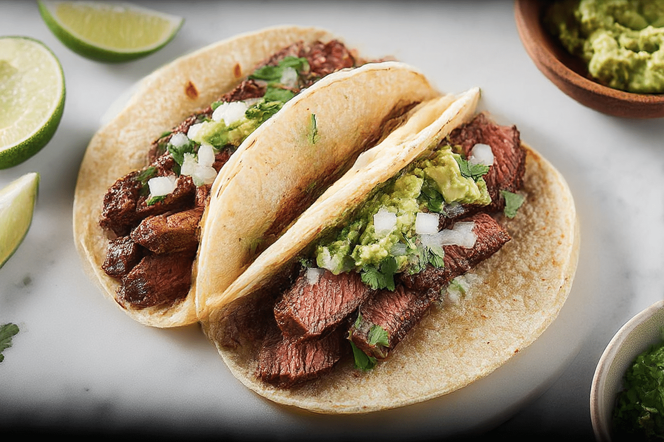 - Assemble the tacos: Place sliced steak into tortillas, top with onion, cilantro, lime juice, and optional toppings.