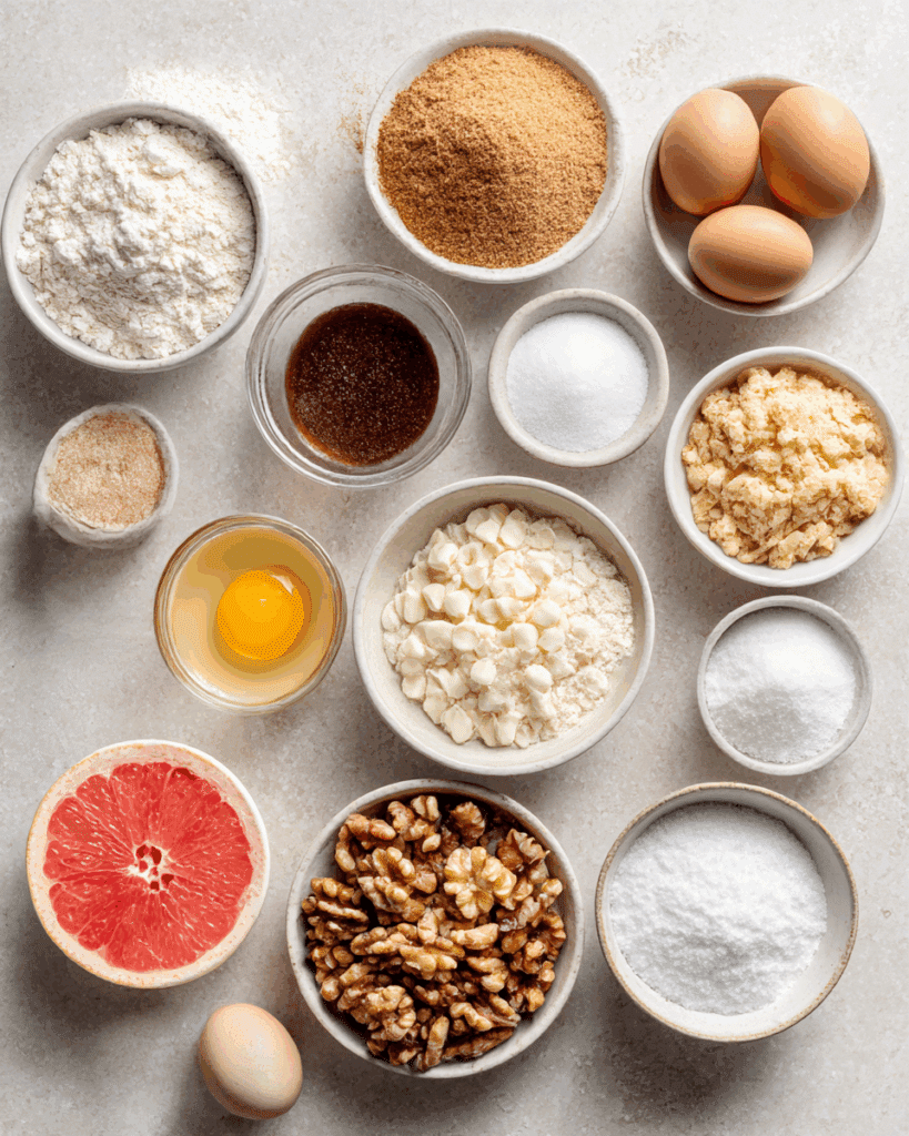 In one bowl, whisk together flour, baking powder, and salt. In another, mix melted butter, brown sugar, eggs, vanilla, grapefruit zest, and juice until smooth. Fold in the dry ingredients, then stir in chocolate chips and walnuts. - Prepare Your Cooking Vessel:
