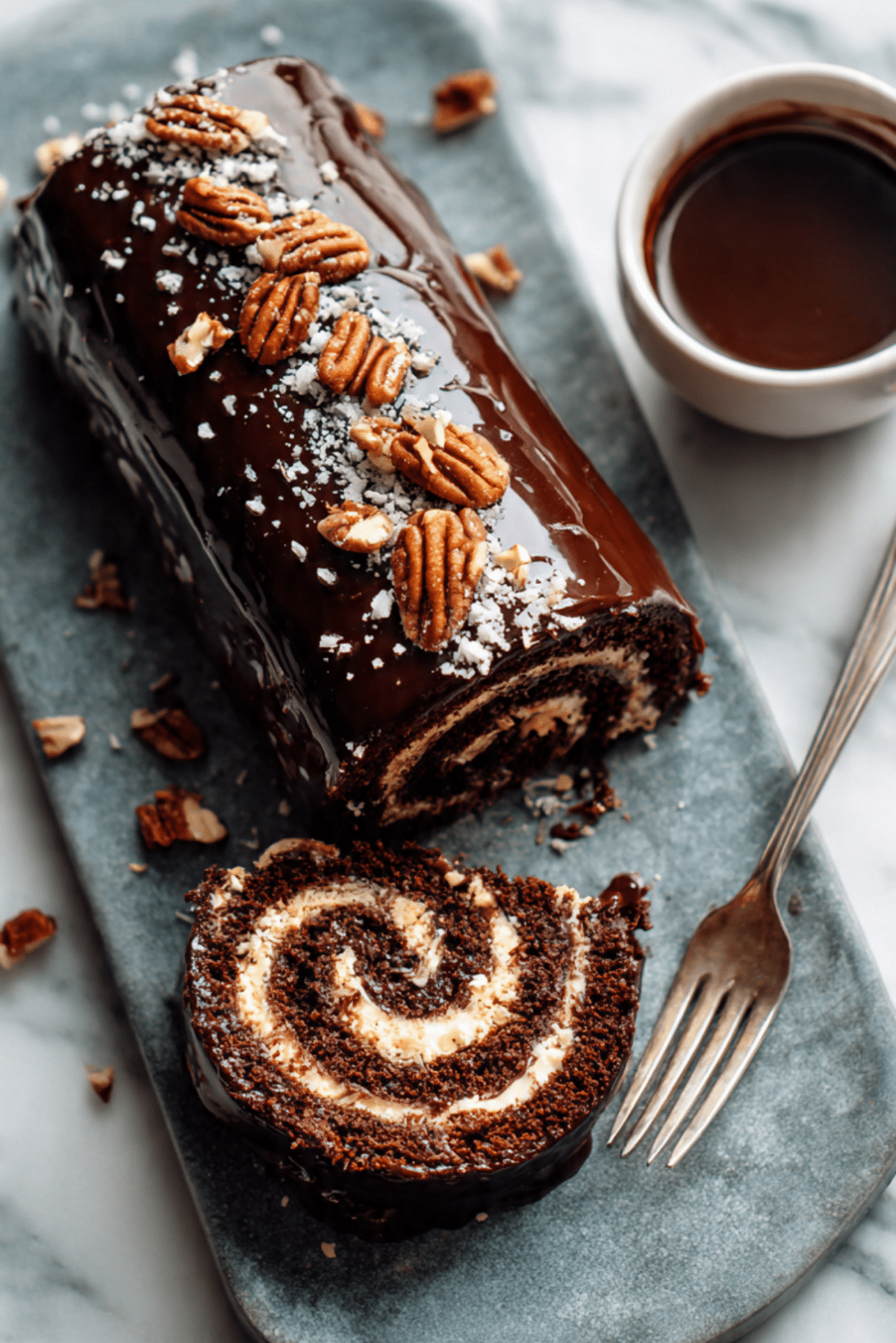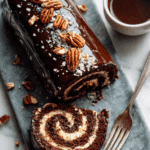 This German Chocolate Cake Roll is a stunning twist on the classic, featuring moist chocolate sponge cake filled with a gooey coconut pecan mixture and finished with a glossy ganache topping.