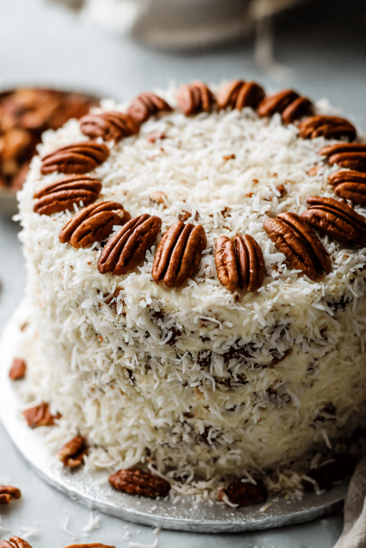 Use a cake stand for height and drama. Garnish with extra toasted coconut and whole pecans in a ring pattern. A drizzle of chocolate ganache can make it irresistible.
