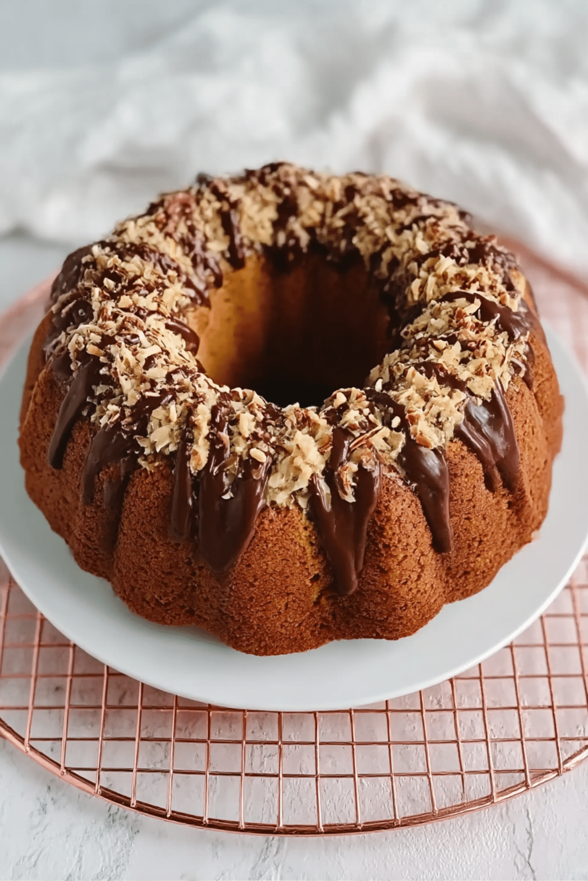 Dense, buttery, and deeply chocolatey, this German Chocolate Pound Cake is crowned with a caramel-like coconut-pecan frosting for an indulgent slice that feels like comfort and celebration in one.
