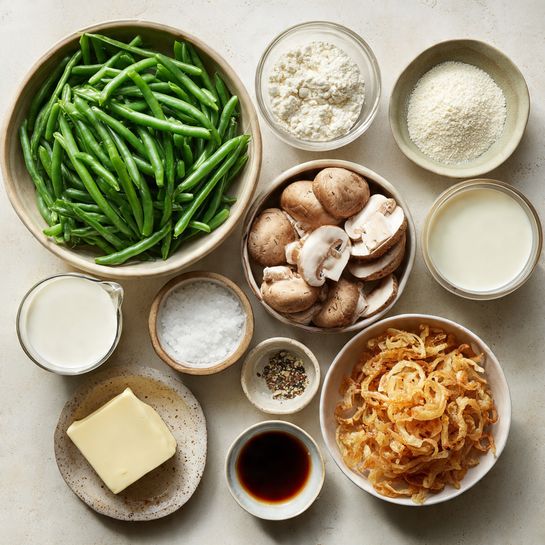 A classic green bean casserole made with tender green beans, sautéed mushrooms, a creamy homemade sauce, and topped with crispy fried onions. Perfect for holidays or cozy dinners.