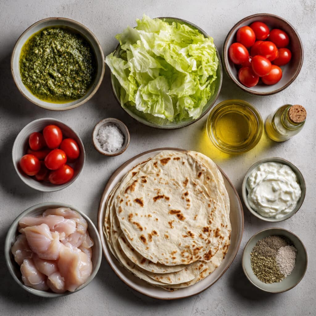 - Assemble the Dish: Slice the cooked chicken into strips. Spread pesto and Greek yogurt on the tortilla, then add lettuce, tomatoes, and chicken.