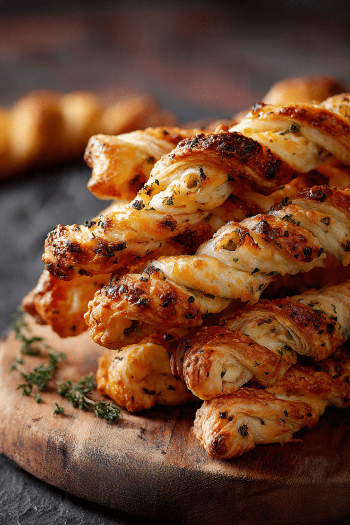 Stack twists in a tall spiral tower on a cutting board and garnish with chopped herbs for a centerpiece-worthy display. Or lay them in a basket lined with checkered parchment for rustic charm. Serve with colorful dips in ramekins to add visual variety.