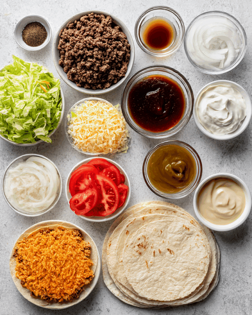 - Assemble the Dish: On a clean part of the griddle, place tortillas. On half of each tortilla, sprinkle cheddar and mozzarella. Add a cooked burger patty, then layer with onions, tomatoes, and lettuce. Fold over like a quesadilla.