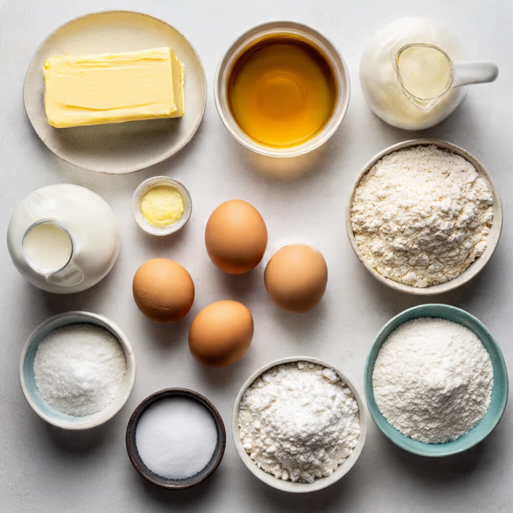 - Whole Milk: 2 cups (480 ml) Adds creaminess to both the choux and the custard.