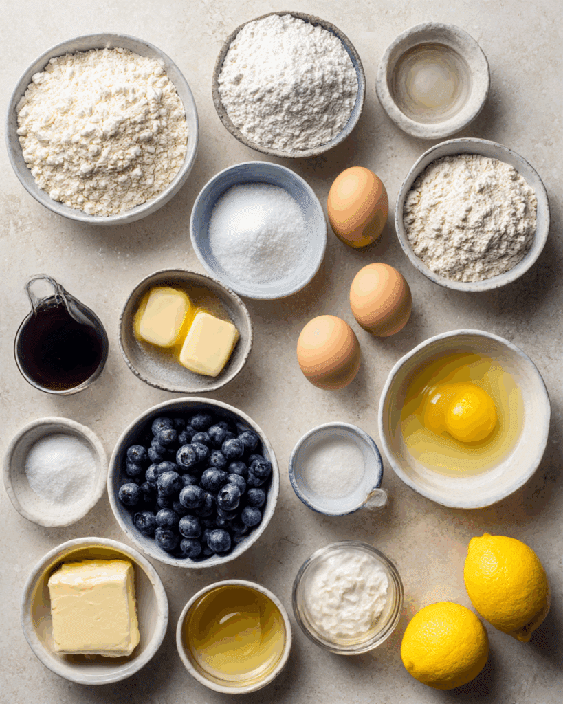 Blueberries: These little bursts of color and sweetness add freshness and moisture to every bite, especially when they bake into the crumb.