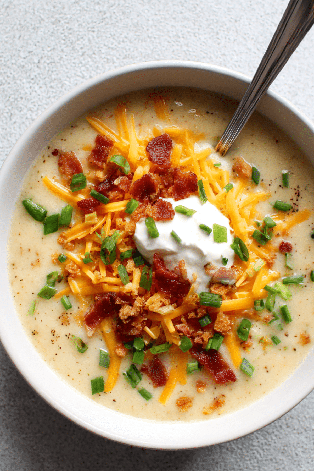 Serve in deep bowls with a generous sprinkle of shredded cheese, crispy bacon bits, and fresh green onions. Add a dollop of sour cream right in the center for that restaurant-style finish.