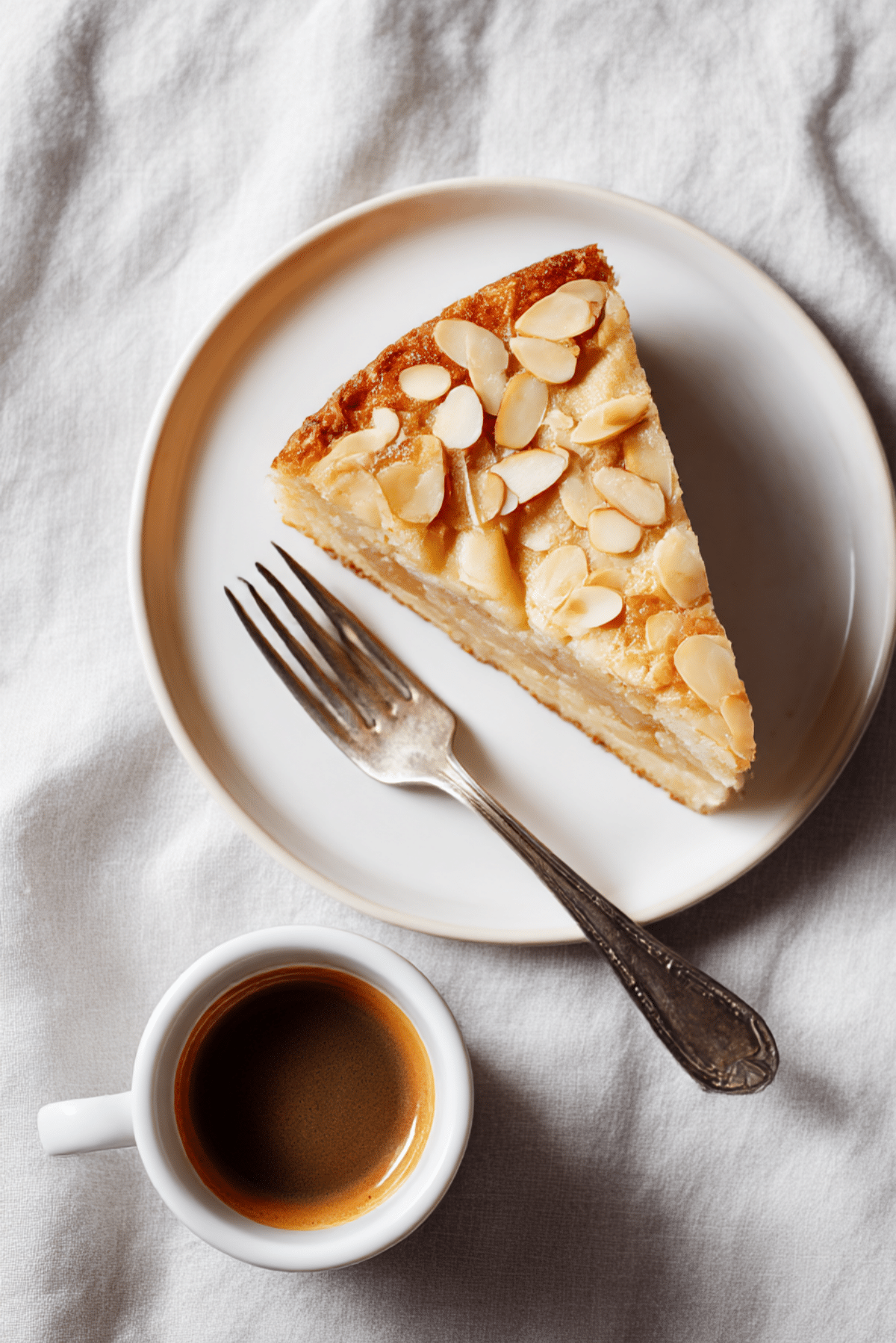 You get a moist sponge sweetened by butter and sugar, studded with tender-tart apple slices and a delicate crunch from flaked almonds. The almond extract note gently lifts the flavors. It’s simple, but every element plays its part.