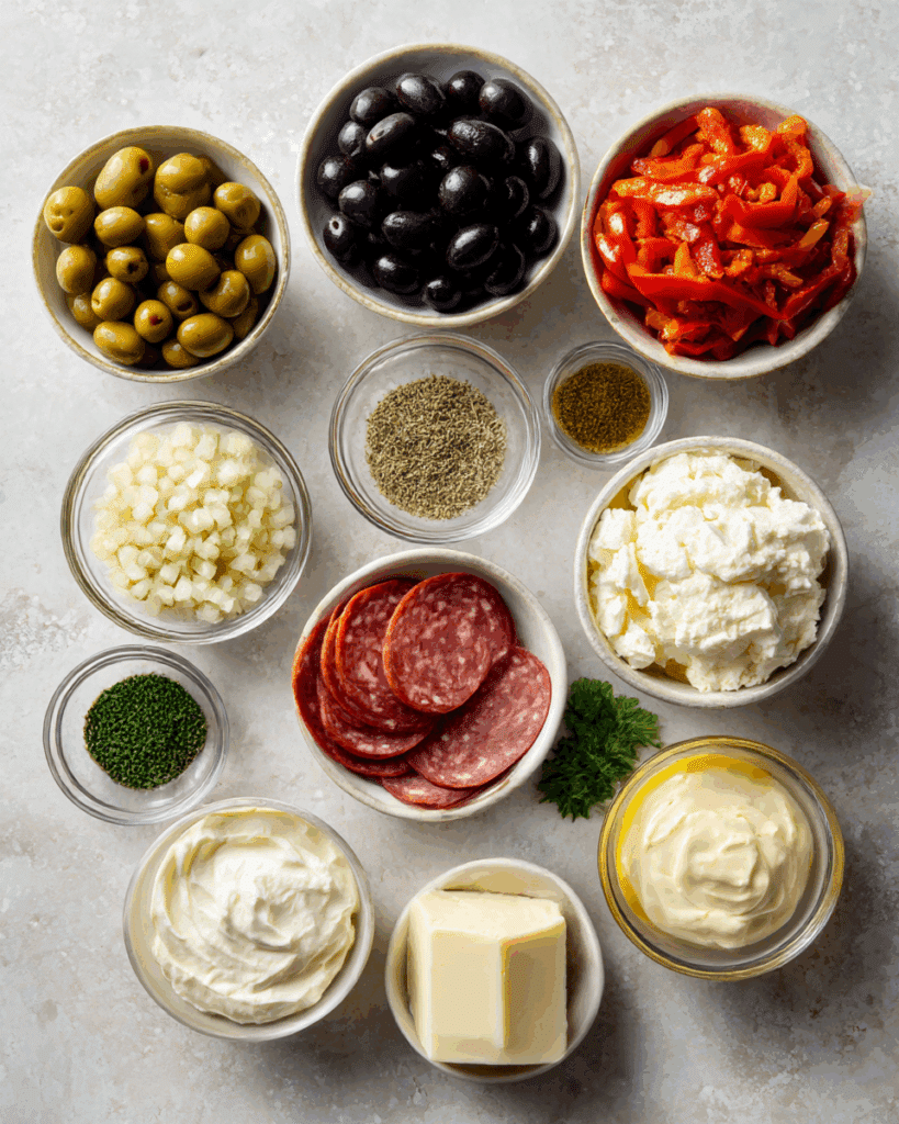 - Combine Ingredients: In a large bowl, mix the cream cheese and mayonnaise until smooth. Stir in the chopped olives, red peppers, giardiniera, provolone, salami, garlic powder, Italian seasoning, and parsley.