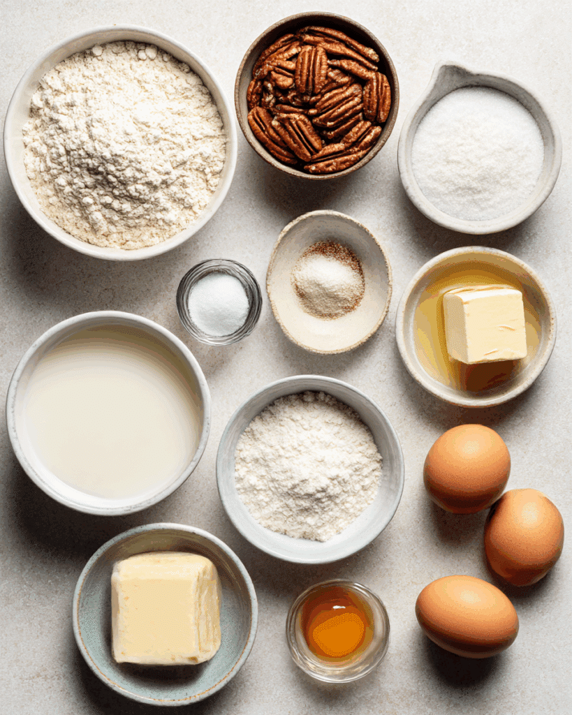 • Chopped Pecans: 1 cup (divided) – Adds nutty crunch in the batter and topping.