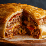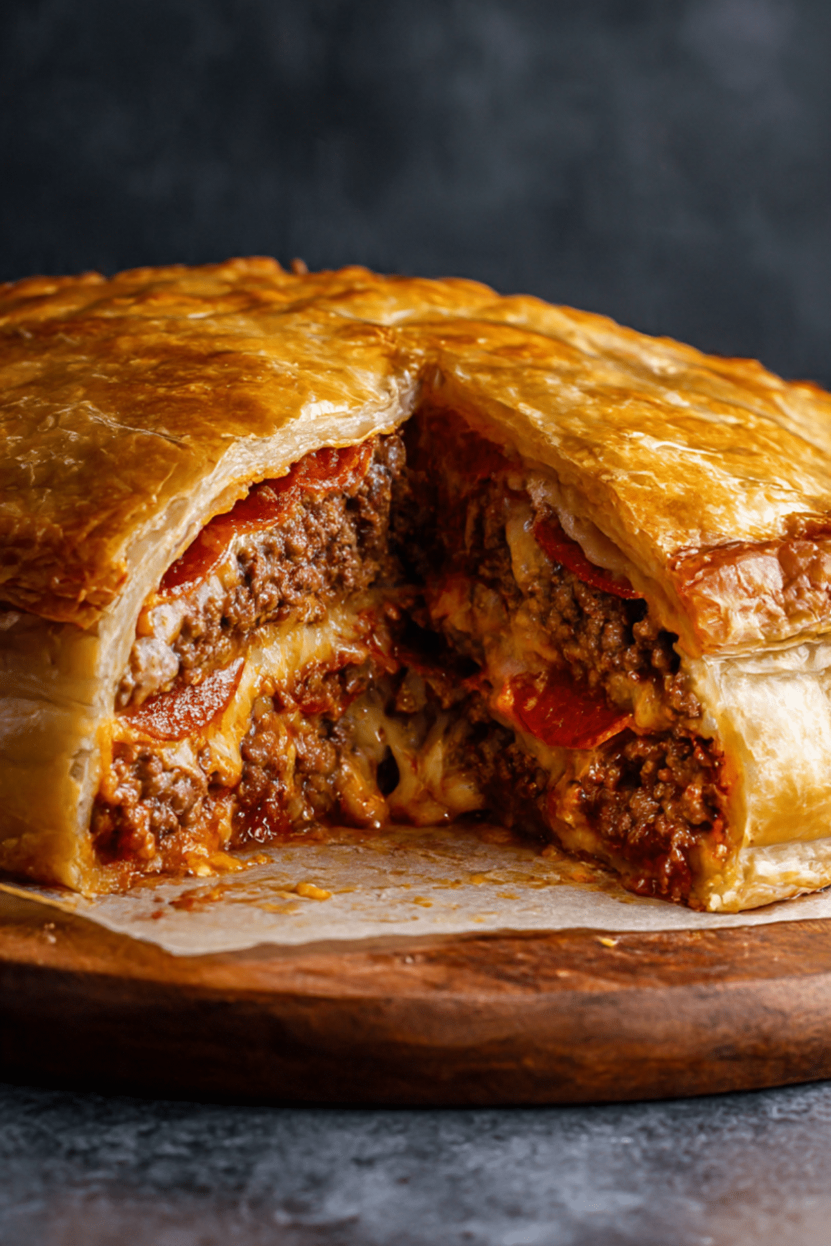 A cheesy, savory fusion of pizza and burgers wrapped in golden puff pastry. This Pizza Burger Pie is hearty, comforting, and packed with flavor.