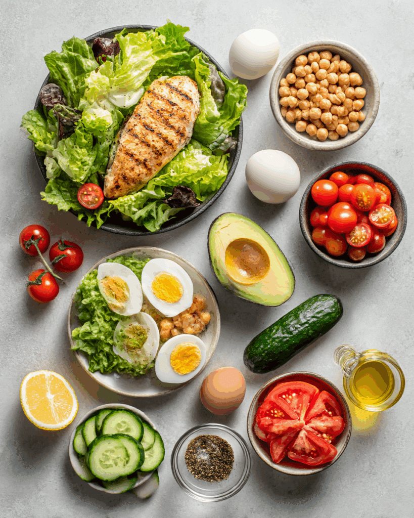 - Assemble the Dish: Arrange dressed greens at the base, then group or scatter chickpeas, chicken, cucumber, cherry tomatoes, feta, red onion, olives, and egg halves.