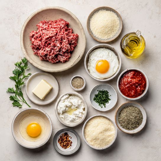 - In a large bowl, combine ground beef, ricotta, egg, Parmesan, garlic, breadcrumbs, parsley, salt, and pepper. Mix gently.