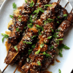 Savory, smoky, and sweet, these Sesame Ginger Beef Skewers are marinated to perfection, grilled until tender, and finished with a sprinkle of sesame seeds and green onions for an unforgettable bite.
