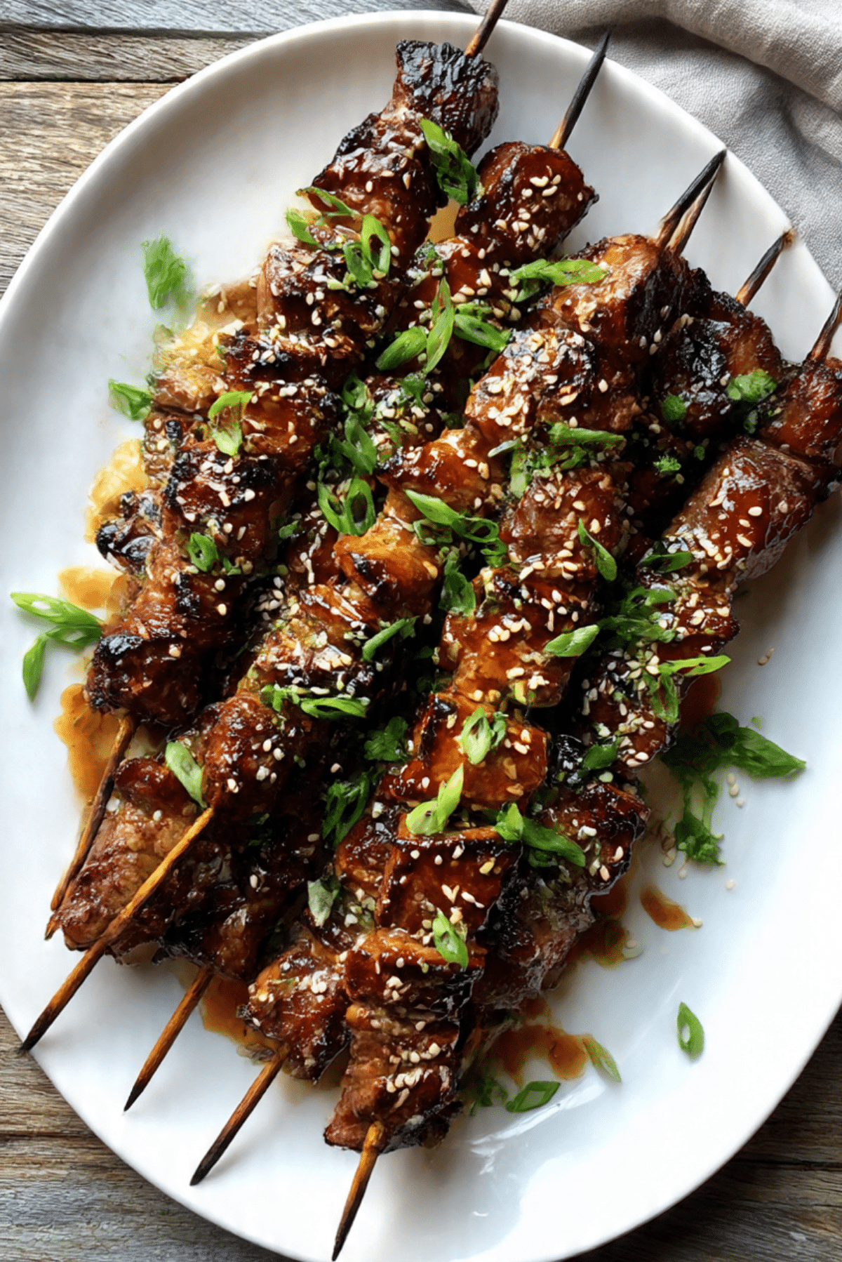Pile the skewers high on a large white platter, sprinkle liberally with sesame seeds and green onions, and surround with lemon or lime wedges. A sprinkle of chili flakes adds color and edge. For bonus points, add edible flowers or microgreens.