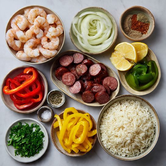 Shrimp: When added at just the right time, they soak up the spices and roast to juicy perfection, bringing sweetness and richness that balance the bold sausage and peppers.