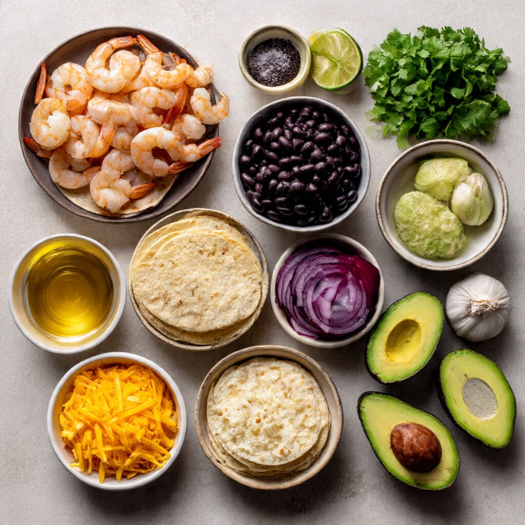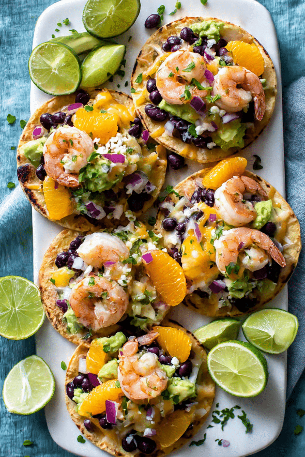 You can prep the salsa, beans, and even cook the shrimp in advance. Store each component in separate containers in the fridge. Crisp tortillas just before serving to maintain that crunch. Leftover toppings last up to 2 days. Shrimp can be gently reheated in a skillet.