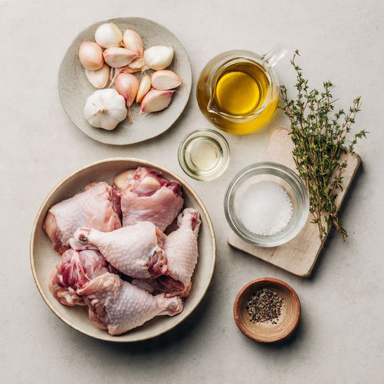 Drizzle olive oil into the bottom of the pan. Add turkey pieces, garlic halves, shallots, and herbs. Sprinkle salt and pepper over everything. - Prepare Your Cooking Vessel: