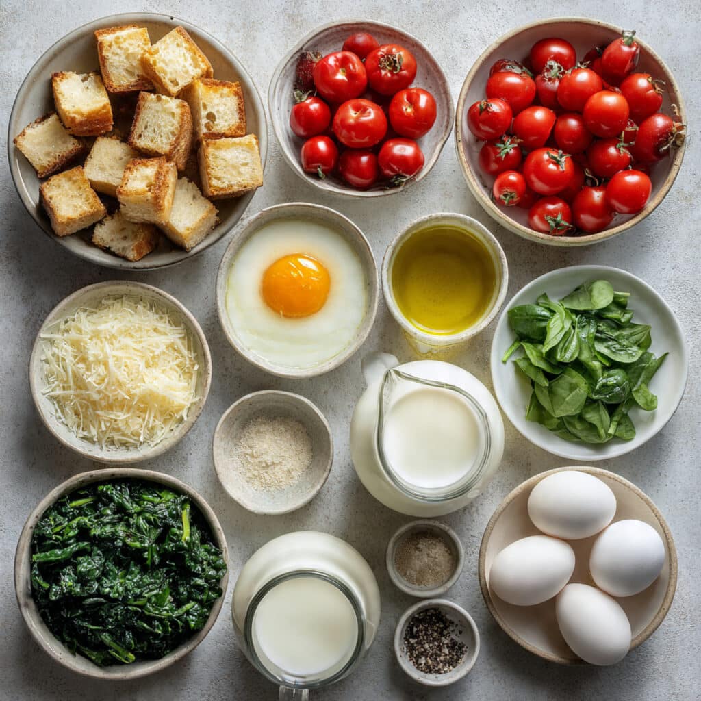 Strata has long been a staple of brunch tables and holiday mornings across American kitchens, but its roots go back to layered savory bread puddings. This version brings together the heartiness of day-old bread with Mediterranean-inspired flavors—roasted tomatoes, leafy greens, and a touch of garlic. It’s timeless, but also fresh.