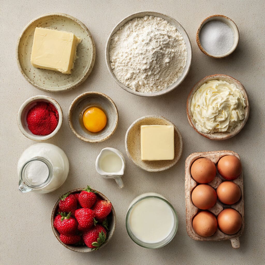 - Fresh Strawberries: Choosing the ripest berries possible is key, as their juice will slightly soak into the top of the cake, creating extra flavor.