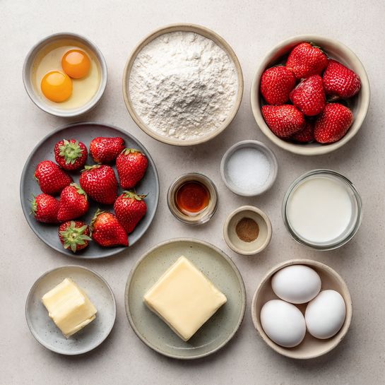 Pour batter into the prepared pan and smooth the top. Arrange strawberry halves cut-side down across the surface. Lightly press them in. - Cook to Perfection: