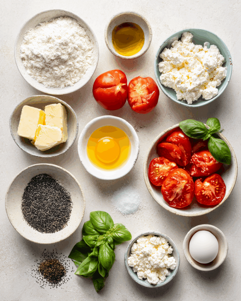 Ingredients in Tomato and Basil Galette with Feta and Poppy Seed Pastry