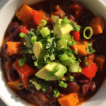 A hearty and colorful vegetarian chili loaded with black beans, red kidney beans, sweet potatoes, bell peppers, and topped with fresh avocado, green onions, and cilantro. This dish is comforting, nutritious, and perfect for any meal.