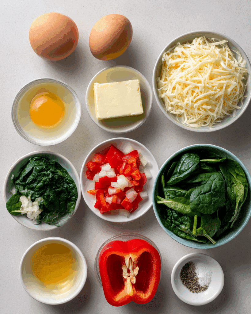 Spinach: This leafy green is not only nutrient-packed with iron and vitamins, but it also wilts beautifully into the eggs, adding a soft, earthy layer.