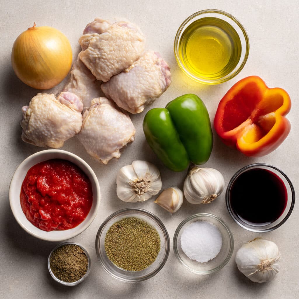 A hearty and comforting Italian-inspired dish made with tender chicken thighs simmered in a rich tomato sauce with peppers, onions, and garlic. Perfect for a cozy weekday dinner.