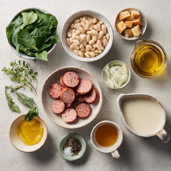 Serve in a cast iron skillet straight to the table, garnished with herbs and a handful of golden croutons. The contrast of colors — green spinach, golden sausage, creamy beans — makes it pop. A drizzle of olive oil over the top before serving adds shine and flavor.